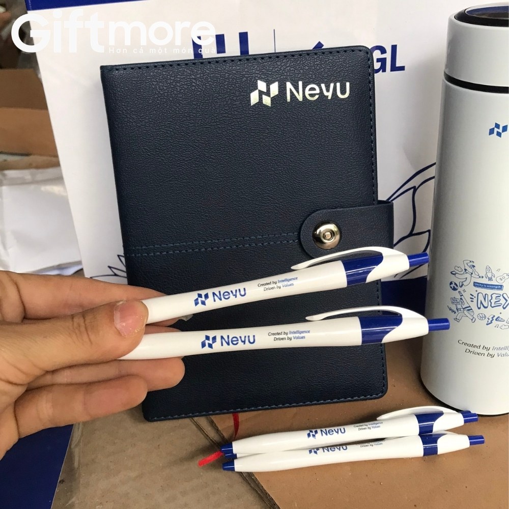 - Bộ quà tặng (Giftset) thiết kế riêng: Hộp quà gồm sổ tay, bút ký và bình giữ nhiệt, có thể khắc laser tên riêng từng người.
