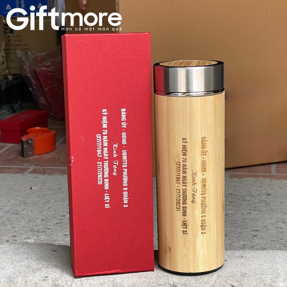 - Bình giữ nhiệt vỏ tre (từ 160.000đ): Sự kết hợp giữa lõi inox 304 an toàn và lớp vỏ tre ép tự nhiên. Khi khắc laser, logo sẽ có hiệu ứng cháy xém tinh tế, tạo nên dấu ấn thương hiệu sang trọng và khác biệt.